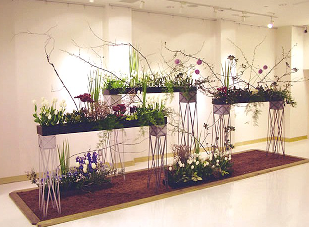 ガラスや陶器、木製オブジェなどと生花を組み合わせた、 器と一体化したアート作品を創作。空間に立体感と存在感を与えます。